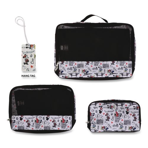 This packing cube set includes three packing cubes (small, medium and large) plus a matching luggage tag. Features Minnie and Mickey Mouse print.